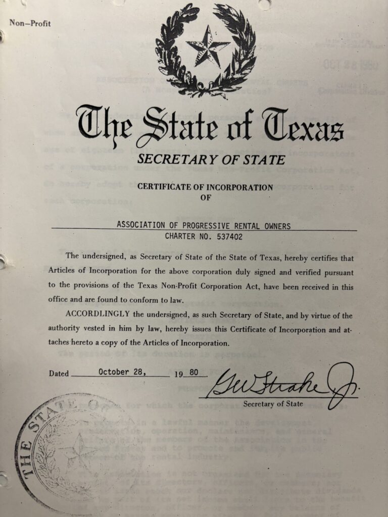 The idea of “professionalism” was much discussed, with the group ultimately settling on the name that still exists today: The Association of Progressive Rental Organizations. I no longer remember how “professional” evolved into “progressive”; only that it did.